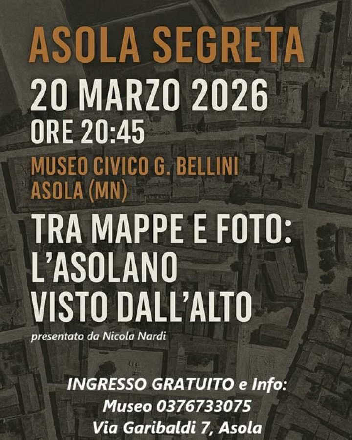 Venerdì 20 marzo alle ore 20.45 Tra mappe e foto: l’Asolano visto dall’alto con l’Avv. Nicola Nardi, ideatore della pagina divulgativa Asola Segreta, recentemente celebrata per i suoi 10 anni sui social. L’incontro presenterà immagini inedite di Asola riprese dall’alto, frutto di ricerche in archivi, collezioni private e database museali. Sarà possibile osservare i cambiamenti del paesaggio urbano e agricolo e conoscere curiosità e aneddoti storici della città.