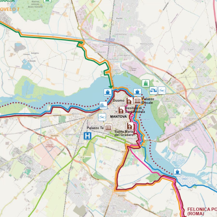 Intorno alla città e attraverso di essa si incrociano diversi cammini di turismo lento, alcuni antichi, altri più recenti o in via di costituzione, ma che comunque ricalcano vie di transito che dall’alto Medioevo collegavano il centro-nord Europa con Roma.