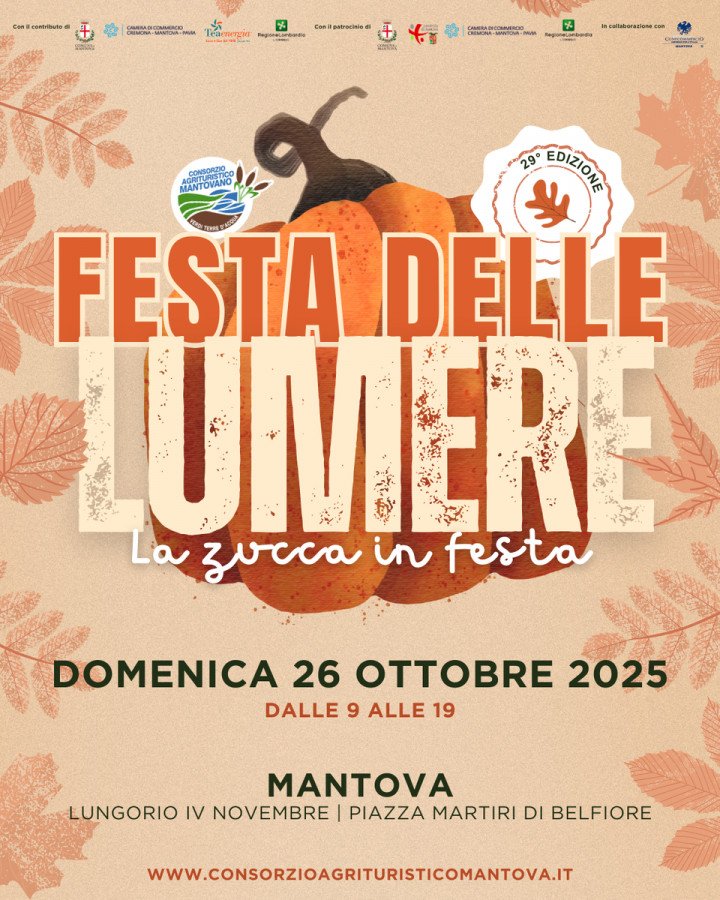 La Festa delle Lumere, promossa dal Consorzio Agrituristico Mantovano con il patrocinio del Comune di Mantova, celebra un’antica tradizione contadina che nella notte di Ognissanti illuminava le campagne mantovane. Le zucche, svuotate e intagliate, diventavano volti e figure fantastiche per esorcizzare la paura della morte e rendere omaggio al legame fra il mondo dei vivi e quello dei defunti.