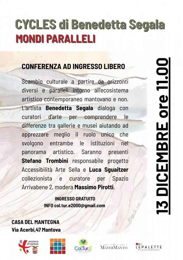 L'evento e' presentato dal Collettivo Col.Tur.E e l'Associazione Mater Manto, con la curatela di Beatrice Bassi, all'interno della mostra Cycles di Benedetta Segala