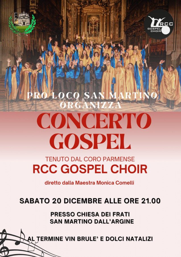 Concerto Gospel Protagonista della serata sarà il coro parmense “RCC Gospel Choir”, diretto da Monica Comelli, che accompagnerà il pubblico in un viaggio musicale tra gospel ed emozionanti canti natalizi, regalando energia, condivisione e un’atmosfera unica.